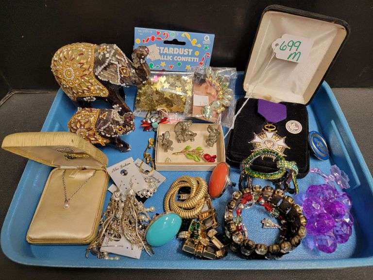 Brooches, Medals, Earrings, Elephant Figures, Bracelets, Rings, Pewter Mice