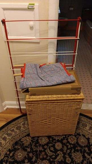 LOT 1144 - Clothes Drying Rack, Hamper, and Bamboo Bath Tray