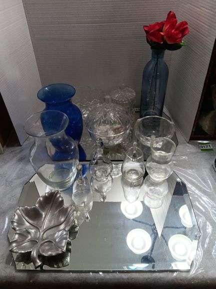 LOT 164 - (2) Mirror Trays w/ Assorted Glass Serving Pieces