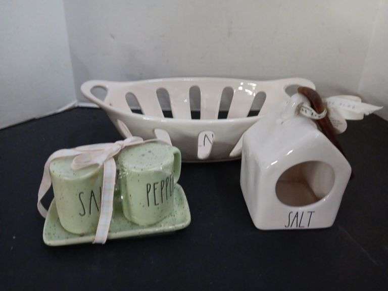 LOT 48 - Rae Dunn Bread Basket, Salt Cellar, and Salt & Pepper Shakers