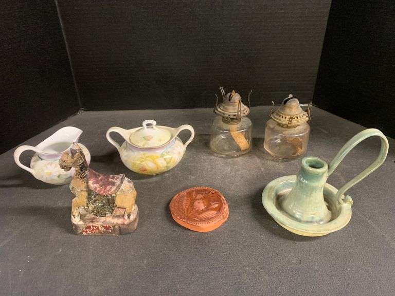 LOT 224 - Oil Lamps, Pottery Candle Holder, Carved Wood Horse, and More