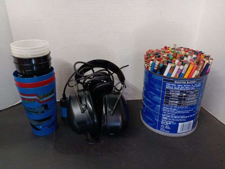 LOT 308 - Large Assortment of Pencils, Plastic Cups, and Peltor Headset