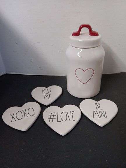 LOT 319 - Rae Dunn Heart Canister and Valentine Coasters