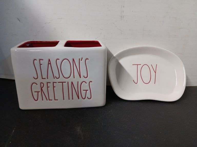 LOT 320 - Rae Dunn Joy Soap/Trinket Dish and Season's Greetings Utensil Sorter