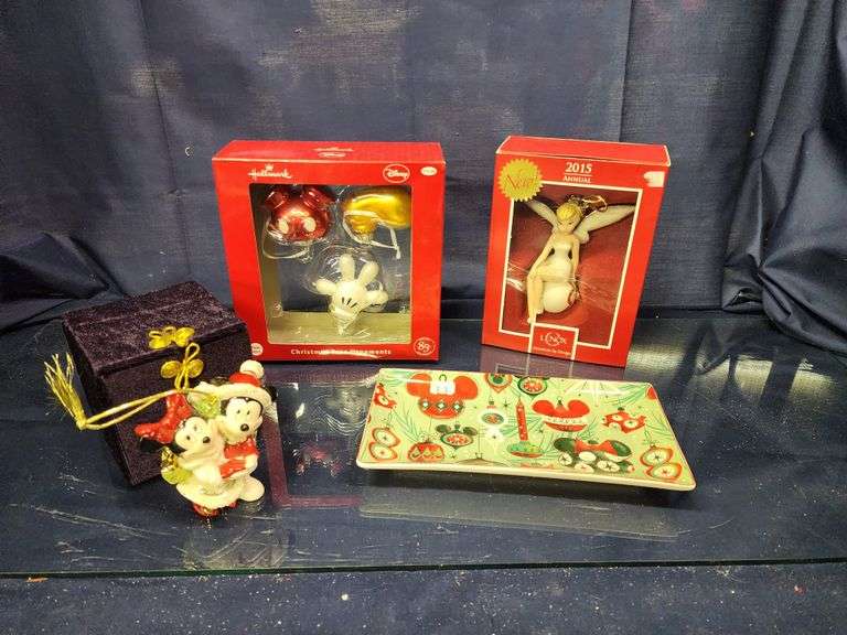 LOT 661 - Lenox Tinkerbell Ornament, Lenox Mickey and Minnie Ornament, Disney Candy Dish, and Disney Hallmark