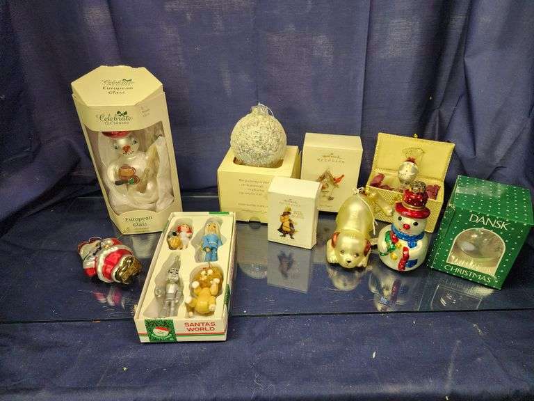 LOT 668 - Wooden Wizard of Oz Ornament Set, Blown Glass Snowman, Hallmark Ornaments, and More