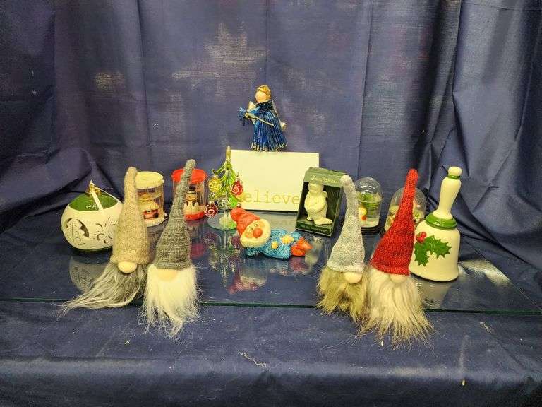 LOT 670 - Gnomes, Glass Christmas Tree, Snow Baby, Believe Sign, and More